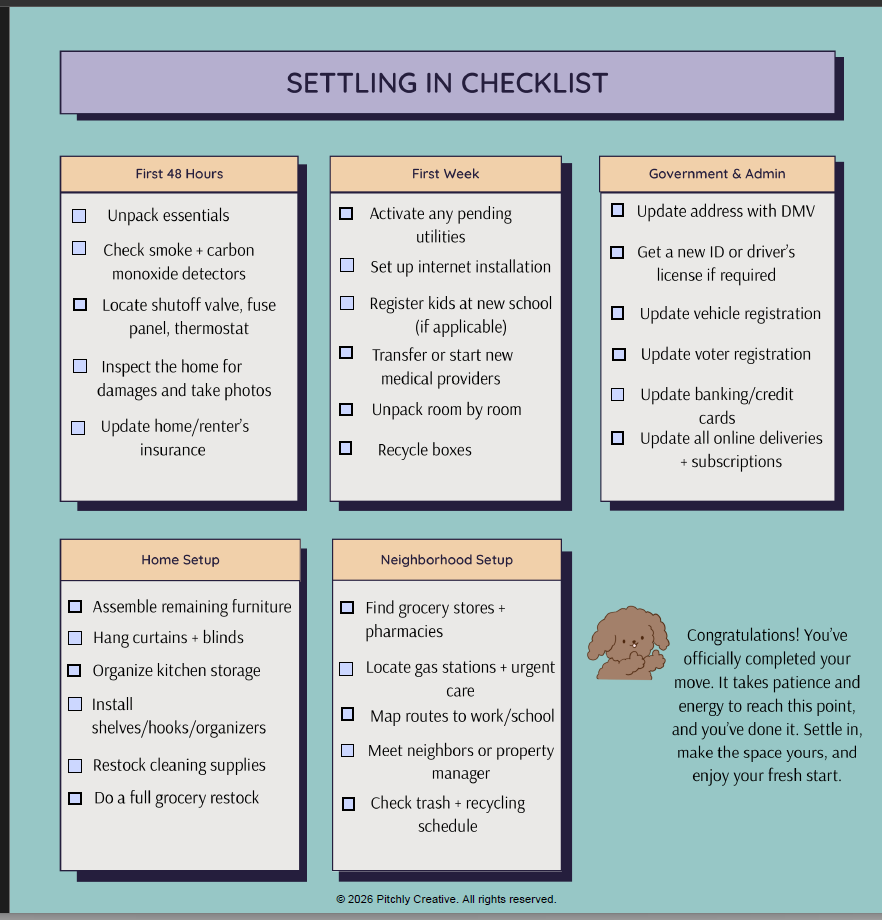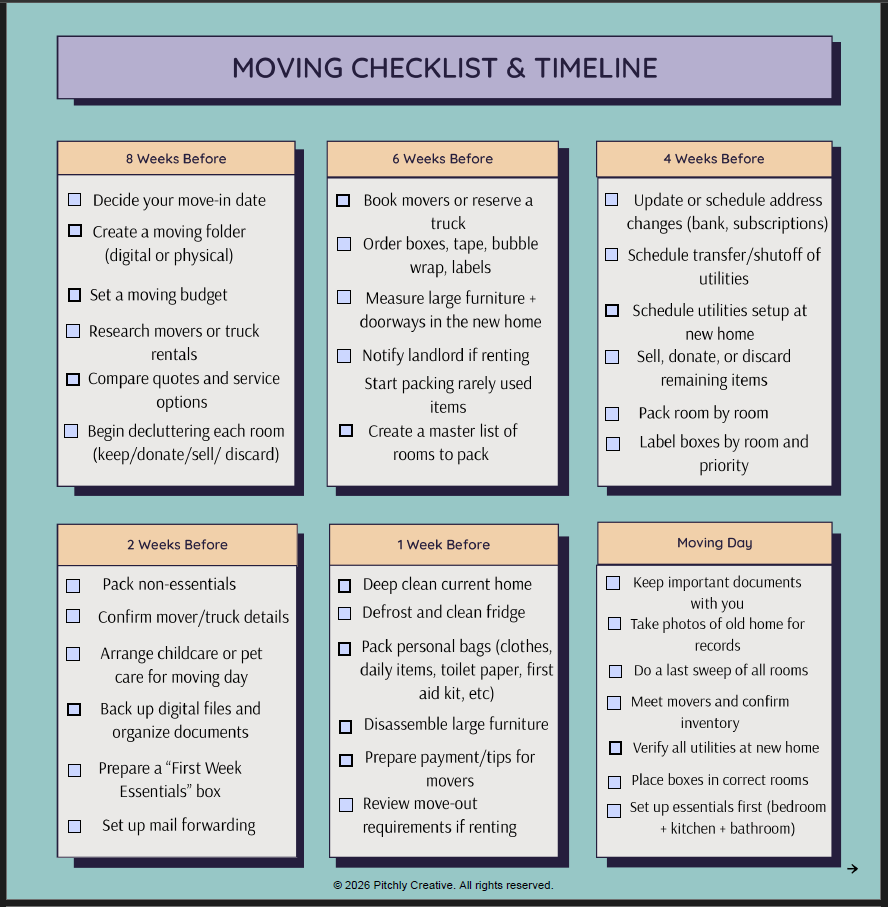 Moving creates unnecessary decisions at a time when attention is already stretched. This checklist is designed to remove guesswork by laying out what to do and when, from early preparation through settling into your new place.